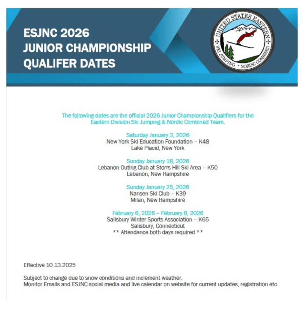 The 2025 Eastern Division Junior National Team will be named at The Salisbury Winter Sports Association’s Jumpfest, Feb 9th, 2026 in Salisbury, CT.