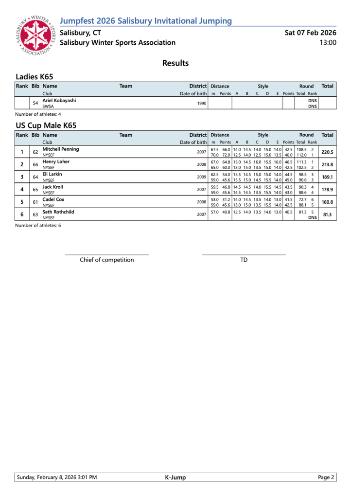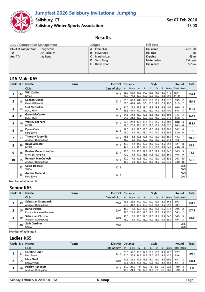 SWSA Results K65 2/7/26 February 21, 2026easternskijumpingLeave a Comment on SWSA Results K65 2/7/26 Related